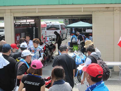 11:23 ピットウォーク ST600の予選終了後、11:10からピットウォークが開催されます。 ピットからマシンを出して、ピットウォークの準備をします。 そして、またレーシングスーツを着て、ファンの来場を待ちます。 暑い中大変ですが、さすが国際(A)、タフですね。 |