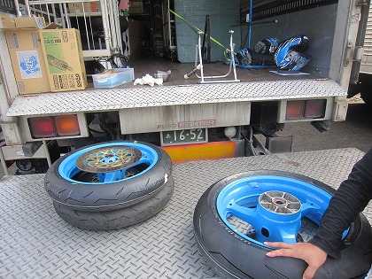 14:57 決勝のタイヤも準備 予選が終わって、決勝用のタイヤを準備。 明朝のウォーミングアップ走行は、今日予選で使ったタイヤで走ります。 タイヤマーキングをしたもう1本の新品タイヤは、もちろん決勝用です。 ここで問題。 フロントホイルは、予選用・決勝用・レイン用の3セットがあるので、問題は無いんですが、リヤホイルが1個ベアリングの動きがイマイチ渋く使うのは控えた方がよさそうです。 レインを履いているホイルは、ちょっとバランスが悪くて、決勝に使うのは避けたいところ。 そこで、① レインを履いていたリヤのホイルからレインタイヤを外す。 ② 予選の時に履いていたタイヤを外す。 ③ レインを履いていたホイルに、予選の時に履いていたタイヤを取付け。 ④ 予選の時に履いていたホイルに決勝用の新品のタイヤを取付け。 ⑤ 明日のウォーミングアップ走行に備えて、予選の時に履いていたタイヤをマシンに取付け。 って、したわけです。 タイヤサービスがないので、人力です。 結構疲れました。 (^_^;) |