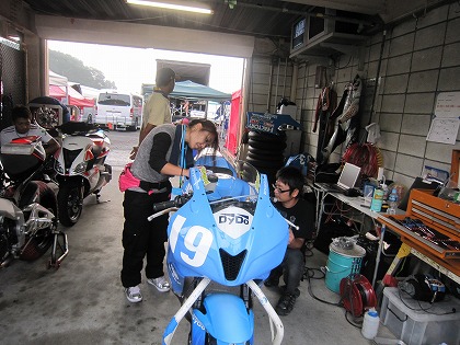 17:27 整備終了 クラッチの交換も終わり、各部の確認。 セッティングも終わりました。 マシンもピカピカに磨いて明日の決勝を待ちます。 |