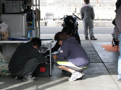 13:07 走行2回目の準備 ART走行1回目が終わり、2回目の走行の準備をします。 昼食を食べて、ART走行2回目の準備。 今日は先週の合同練習のときより、ぐっと気温が下がり、タイヤウォーマーの温度の上がりが悪いです。 風も強く、タイヤの熱を奪っていくので、タイヤの前にプラスチックの板を立てて風よけ。 |