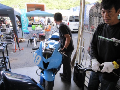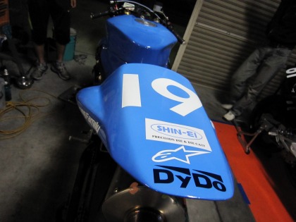 18:32 予選の準備 ART走行後、明日の予選の準備。 セッティングなど、もう一度見直し。 カウルを練習用から、予選・決勝用のよそいきに。 今回サポートしていただいたKさんの会社 SHIN-EI のステッカーをリヤカウルに貼り付け。 (今回、わずか1戦のみになってしまいましたがご了承ください。) 明日の予選の準備も終わったら、宿に撤収します。 予選に続く。 |