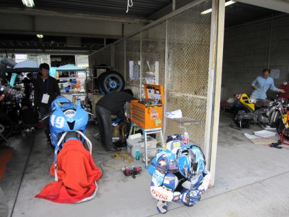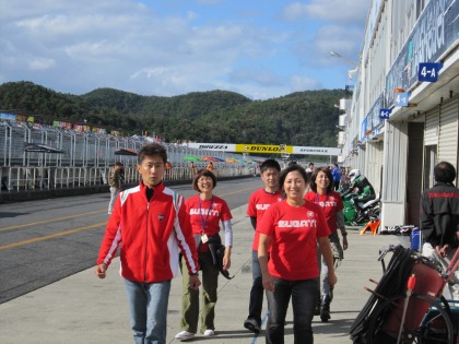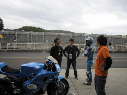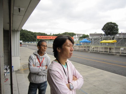 15:15 赤い軍団(?) 國川選手のB組の予選は15:20から。 予選2回目は、他のチームが行っているのと同じように、予選途中でタイヤを新品に交換する予定です。 そのため、Team SUGAI に助っ人をお願い。 須貝さん自ら手伝いにきてくれました。 |
