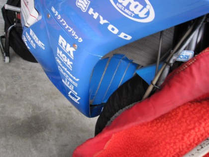 9:23 気温が低い 9:15からJ-GP3クラスの予選が始まっています。 隣のピットのJ-GP3がピットイン。 どうやら、オーバークールの様で、ラジエータにガムテープを貼って再度コースインしていきました。 やはり、今朝は気温が低めです。 國川くんのマシンもラジエータにガムテープを貼ってオーバークール対策をしておきます。 |