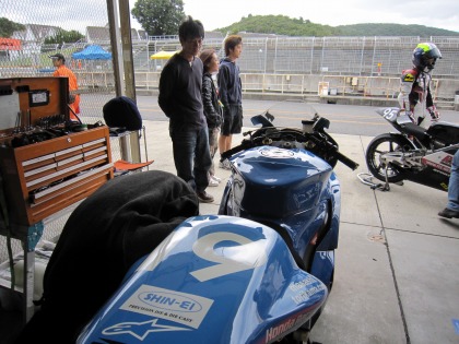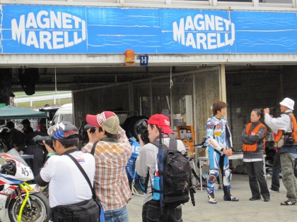 11:11 ピットウォーク 11:10からは恒例のピットウォーク。 今日のピットウォークは11:10〜11:55の45分間 ピットの前にマシンを駐めて、レースファンの方々を待ちます。 予選が11:00までで、10分後からピットウォーク。 SUGOほど猛暑じゃないので少しは楽ですが、それでも予選終了10分後からは大変だ。 |