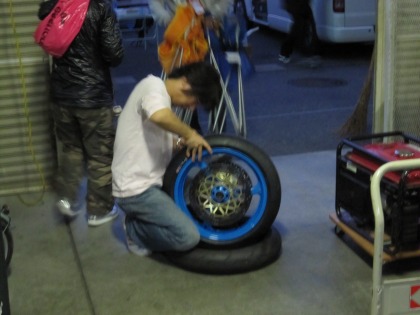 18:09 決勝準備 予選終了後は決勝の準備。 セッティングを確認して、オイルなど交換。 タイヤに貼ってあるステッカーを剥がしているのは、手伝いに来てくれたレプソル21原さん。 PIRELLIユーザーなら知っているが、このステッカー、超〜剥がし難い、ヘルパー泣かせ。 (T_T) どうも、ありがとうございます。 m(_ _)m |