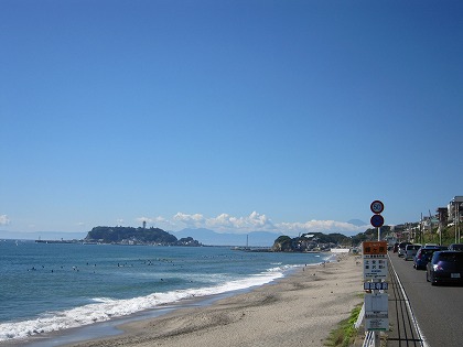 11:44 快晴 横須賀の自宅を出発して、国道134号線で西走して30分、毎度の江ノ島が見えてきました。 いやいや、今日は天気がイイ! 快晴です。 まさにツーリング日和。 道路標識の向こうにちっちゃく富士山を見ることができます。 日中の気温は25℃を超えて、道路脇にある気温表示は27℃、10月ですが夏日です。 |