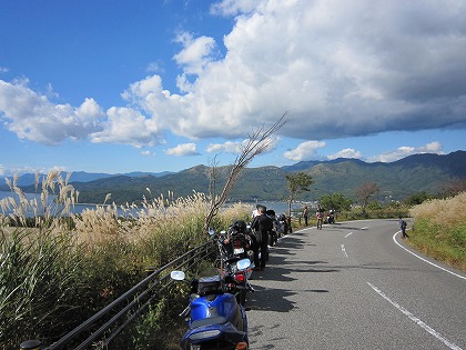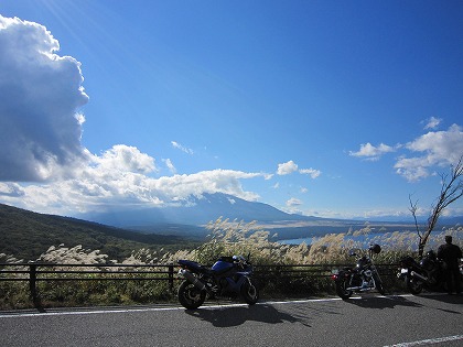 13:29 バイクが増えた 三国峠を越え、山中湖側に入ると、あたりはススキの原。 太陽の光を浴び金色に輝くススキの穂が風にゆれてきれいですね。 この路線も以前に比べると、バイクの数が増えました。 標高の高いこのあたりは、すでに紅葉が始まっていました。 上空の雲が、なんかPHOTO SHOPで書いたようにわざとらしい? |