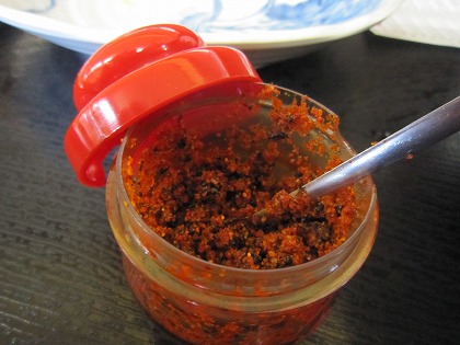 13:58 すりだねと言うらしい 各テーブルに置いてある唐辛子。 すりだねと言うらしい。 七味、一味の代わりだね。 唐辛子をつぶして練ってあるので、当然ながらかなり辛い。 これを入れると、味が引き締まります。 (^o^;) |