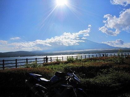 14:14 ふたたび山中湖 山中湖畔を走っていると、富士山山頂の雲が切れたので、バイクを駐めて写真を一枚。 またまた、逆光。 なかなか、完全に雲は切れませんね。 山頂付近はまだ雪は無いようです。 |