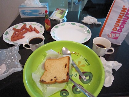 9:54 朝食 今日の朝食。 初日の夜にセブンイレブンで買ったブドウパン。 それに、昨日夕食を食べたショッピングモールで買ったドーナツ。 そして、嫁さんのリクエストで日本から買っていったソーセージ。 簡単に済ませます。 |