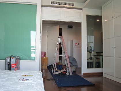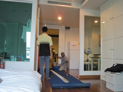 9:55 扉の取り付け 今日は部屋に仕切りの扉を取り付ける工事の予定が10時から入っています。 なので、朝食を食べたら、部屋で待機。 |