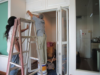 16:06 付きました 部屋に戻ると、扉の取り付け工事は終わっていました。 2〜3時間の予定が6時間弱! (^_^;) 作業にきていたのが、大工さん、見習いの青年、塗装工、そして現場監督みたいな人の計4人。 4人そろって、ほぼ1日作業です。 日本じゃ考えられないね。 ノンビリしているというか。 人件費が安いんだろうね。 ちなみに、この扉の取り付け、扉の材料と工賃含めて、30,000バーツほど(¥83,000) 扉、枠も事前に工場(こうば)で手作りなので安いっちゃぁ安いけど、日本の工事業者ならこんなまどろっこしいことは絶対にしないね。 既製品の定尺もの買ってきて、ぱっと取り付けちゃう。 どっちが良いとは言えないけど、価値はこっちの方がありそう。 そんなこんなで、扉の取り付け工事を眺めているだけで、ほぼ1日終了!(汗) |