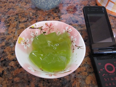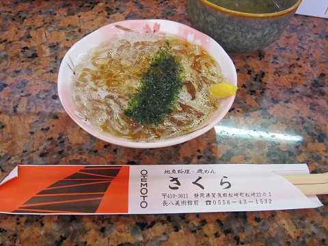 12:17 他に ところてんの原料、テングサは伊豆の特産。 で、ところてんは5種類くらい。 一つは上の、ふつうの細長いところてん。 これは、抹茶味。 ところてん、四角くなれば、寒天? 砂糖が入っていて甘い。 微糖だけど、食事前にはあまりおすすめじゃないね。 その他に、コーヒー味。 これもたぶん甘そうだったので、手は出さなかった。 それに、味のないところてんを四角くした寒天。 置いてあるきな粉や糖蜜をかけて、あんみつ風にして食べるみたい。 そして、もう一つが・・・『忘れたね』 (-_-;) |