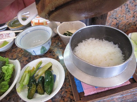 12:27 ご飯がきました 20分ほど待ってご飯とおかずが出てきました。 『おっと!予想以上に早かった』 ご飯は、写真のとおり1ずつ釜で炊くので時間がかかります。 早く出てきたのは、たぶんお客さんが来るのを読んで先に仕込んでるんだね。 なので、1回転すると、最初から炊くので結構待たされる。みたいです。 ご飯はちょっと軟らか目。 これで、茶碗に軽く2杯分。 |