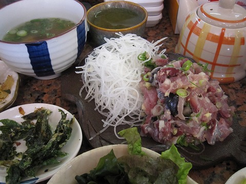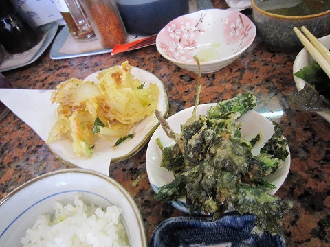 12:30 副菜たち 主菜のアジのたたきがくる前に、副菜が出てきます。 まずは天ぷらでアシタバとタマネギ。 それと写真には写ってませんが、わかめとレタスのサラダ、山かけに漬け物が付きます。 これだけで結構ごはん食べられちゃます。 |