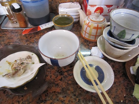 12:44 完食 片っ端から片づけて、完食! おかずの量が多くて、ご飯が足りないですね。 アジのたたきがまだ残っているのに、ご飯が終わっちゃいました。 できれば、ご飯をお代わりしたかったんですが、釜飯だとお代わりできませんね。 と言っても、もうお腹いっぱいですが・・・。(^_^;) 『ご馳走様でした! 美味しゅうございました。』 <(_ _)> お腹いっぱい食べると幸せな人にお勧めのお店です。 会計を済ませて店を出るとき、入ってきたラグビー選手体型のお兄ちゃん。 注文 『○○と△△、あとご飯2つお願いします!』 おおっ!一人で二人前食べるんかい。 強者だねぇ〜。 でも、自分も若かったら、ご飯2つ頼むかも。(汗) |