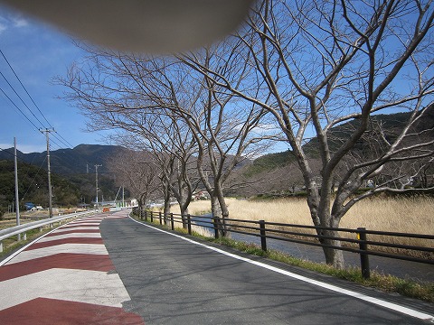 12:58 さくら 昼食を食べさくらを出発して、取って帰って国道136号線を北上。 那賀川に架かる宮の前橋を渡ったところで、右折して県道15号下田松崎線に入り東進します。 那賀川沿いのこのあたりは桜の名所です。 那賀川に沿って植えられた桜は、早咲きの川津桜ではなく、ふつうの桜らしくまだ花は咲いていませんでした。 ※写真に指が。 |