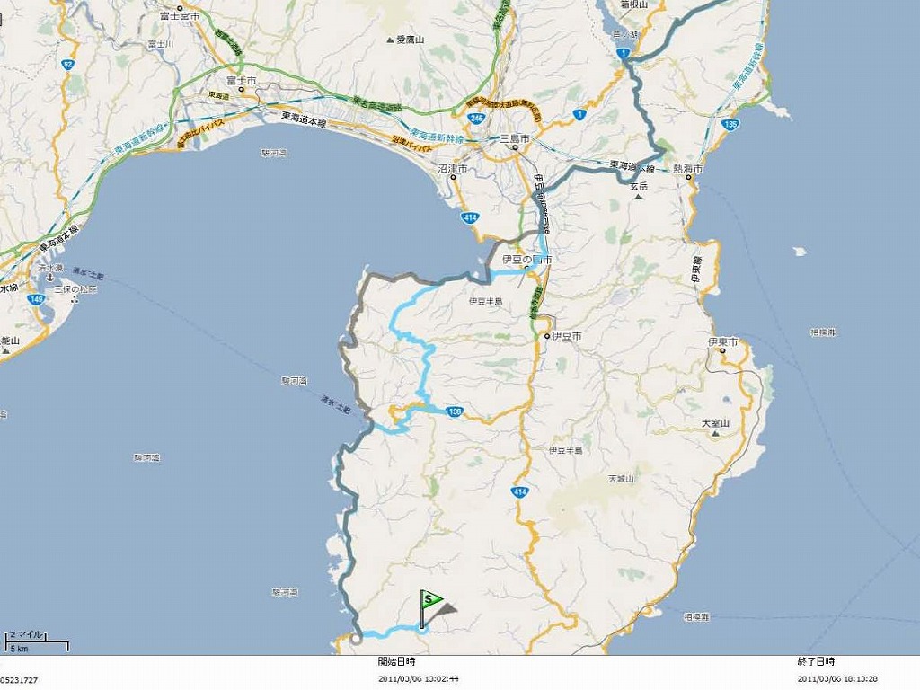 16:22 抜け道は? 県道130号線から後、長岡温泉の繁華街を通り、突き当たって左折して県道129号韮崎伊豆長岡修善寺線に入り、ちょっと走って今度は右折県道131号線に入って狩野川にかかる千歳橋をわたって国道136号線に出ました。 その後は、国道136号線を北上、朝きた、県道11号熱海函南線に入り東進して、笹尻の交差点まで戻ってきました。 県道17号線から県道130号線〜国道136号線の区間は長岡温泉の繁華街を通ることから、抜け道としてはハズレでした。 まあ、西伊豆のツーリングは道路が比較的すいている冬場にしか来ないので、県道130号線には入らずに、そのまま県道17号線で口野口まで進んだ方が良さそうです。 5月の連休以降、来ることがあれば、あきらめてバイク150円をけちらずに有料道路の伊豆中央道を使った方が賢明みたいですね。 |