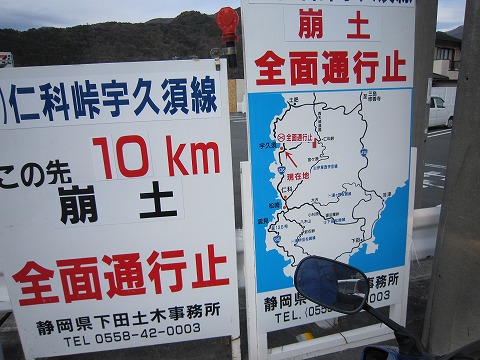 14:41 通行止め 宇久須まで来て、国道136号線を右折して県道410号線に入ろうと思ったら、通行止めの看板。 (>_<) 通行止めの箇所が近ければ、行ってみて、バイクが通れるか確認するんですが、10km先だとちょっと遠いですなぁ。 松崎まで戻って、前回通った県道59号線まで戻るのも一案ですが、時間を見ると結構押してきてます。 今日の夜、横浜でIKEZO君と会う約束があるのと、まだ寒いので日が暮れてからあまり走りたくないのもあって、このまま国道136号線を北上して、土肥まで行って中伊豆に方面に入ることにします。 |