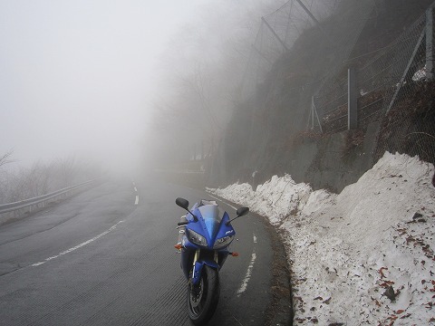 11:34 明神峠を越えると 明神峠に向け標高を上げると、県道147号線は雲の中へ。 それにともない、路面はウエット状態に。 明神峠を越えて三国峠に向かうと、完全に雲の中。 標高を上げるにしたがい温度が下がり気温は6℃。 『寒い!』 山陰になる路肩には、まだ雪が残っていました。 例年であれば、4月に入ると、残雪も消えていたように記憶していますが、今年はまだまだ寒いですね。 |