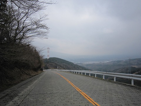 14:15 一気に下って 国道138号線から国道413号へとつなぎ、来た道と同じ県道730号山中湖小山線に入り、三国峠、明神峠を越えました。 標高約900mの明神峠から標高約450mの明神峠入り口までは、約4km、平均斜度11%を超える超下り坂、一気に駆け下りていきます。 コンクリート舗装に施されたスリップ止めが走りにくい。 この”○”のスリップ防止溝は効くんだろうか? 眼下には、ぼんやりと富士スピードウェイ見えています。 と書いているが、写真を見てもわからない。(^^;) |