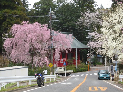 14:47 もう一度 小山からも行きに来た道を取って帰って、足柄峠を抜け、南足柄広域農道で小田原方面へ。 行きに写真を撮った大雄山最乗寺に通りかかると、逆から来たアングルがまた良し! また、バイクを駐めて写真を撮ります。 山門の赤、しだれ桜の桃色、そして名前を知りませんが写真右手の白い花のコントラストがきれい。 R1の青が映えます。と自画自賛。 (^_^)v 以前、知り合いが、「若いうちは、車とかバイクとか女の子とか動く物に興味があるけど、花とか景色とか動かない物に興味が変わってきたら歳を取った証拠だ!」と言っていたのを思い出しました。 そう言えば、若いときは桜が咲いていようと全然興味がなく、灰色の路面だけを一生懸命追っかけていました。 でも、今でも動く物は大好きで、ストライクゾーンが広くなっただけじゃないかな。(爆) |