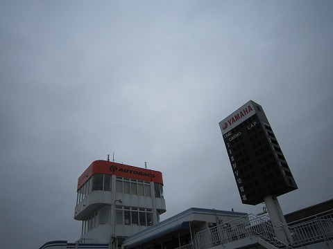 6:28 曇天 1コーナー下のトンネルをくぐってパドックへ。 パドックからコントロールタワーを見上げると、思いっきり曇天。 でも、今すぐ雨が降り出しそうな空気感じゃありません。 午前中はたぶん、大丈夫。 逆に暑くなくて、走りやすいでしょう。 |