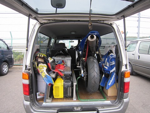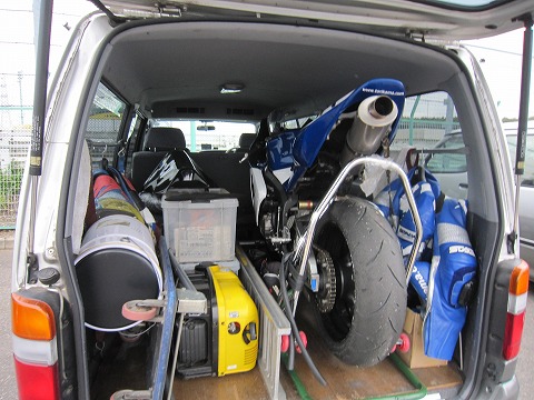 6:28 S字裏に 雨の降水確率がある程度高かったので、ピットはもう少し空いているかと思ったら、意外に混んでました。 来週25日の土曜日は筑波ツーリストトロフィーが開催されるので、それにエントリーしているライダーが練習にきているようですね。 ピットがいっぱいだったので、空いていたS字裏の駐車エリアにハイエースを駐めて、走行の準備をすることにします。 ハイエースの荷台の左右には、レザースーツ。 今日は、雨が降ってもいいように、てるてる坊主代わりに、古いレザースーツも持ってきました。 |