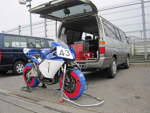 6:55 準備完了 ハイエースからCBRを降ろして、走行の準備。 今日の予約は 8:00〜A1、10:00〜B2、11:30〜B3 の3本。 1本目の走行が、朝一番の8:00からなので、早めにタイヤウォーマーを巻いて、タイヤを暖める。 タイヤは2006年以来、USEDですがDUNLOP。を履いて走ります。 ガソリンを7リッター給油。 今は、6:55。 近隣の住民への騒音対策のためエンジンはかけられません。 エンジンをかけていい7:20まで待ってエンジンを暖機。 |