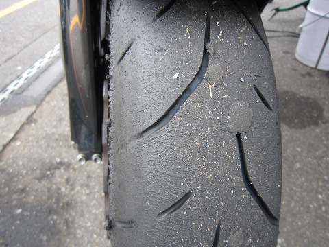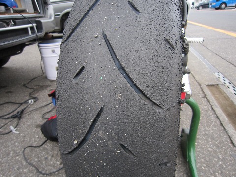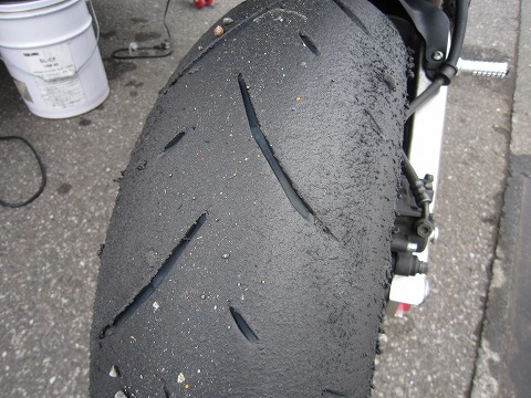 10:34 2本目走行後 2本目、走行後のタイヤ。 エアー圧を標準値(?)に落としたのためか、グリップにしっかり感が出て良好です。 やっぱ、1.8kgは高すぎたようです。 リヤタイヤはここまでで、約120Km使用。 結構、摩耗が早いかも。 BSに比べるとショルダー部分は柔らかく感じられ、吸収性が良いように感じられます。 ホームストレートから1コーナーへのブレーキングでは、不安感はありませんが、スネーキングしやすそう。 そこまで、やるのは怖いので |
