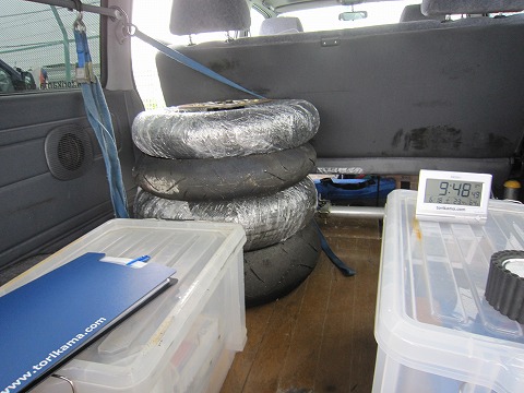 9:48 これもてるてる坊主? レザースーツ同様、てるてる坊主代わりに積んできたレインタイヤ。 2年前の筑波選手権後、スペアーホイールはあるのに、スペアーのディスク板が無いのは不便と言うことで、ヤフオクで中古をゲットしました。 しかし、その後、ウェットでの走行がなく、1回も使ってません。 (>_<) |