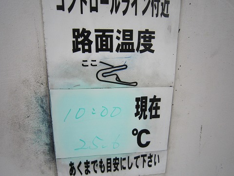 10:40 路面温度 路面温度、25℃。 これも、良いコンディション。 これから夏に向け、路面温度が上がると、タイヤがたれてくるからね。 |