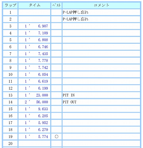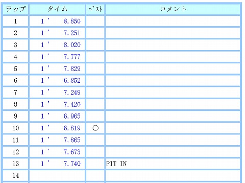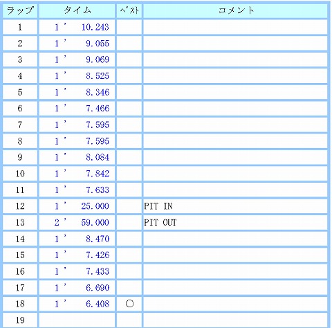 11:50 ピットイン で、13周目にピットイン。 そのまま、集中力が戻らず。 と言うか、今日は午後、これから嫁さんを迎えに成田空港に行かなければなりません。 そう、ここで2年前の悪夢を思い出し、走る気が消失。 (-_-) 残り5分を残して、本日はこれまでとしました。 <(_ _)> |
