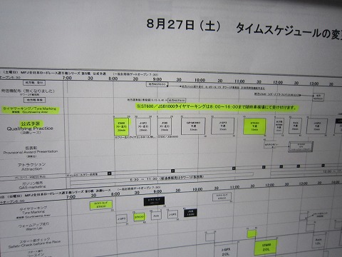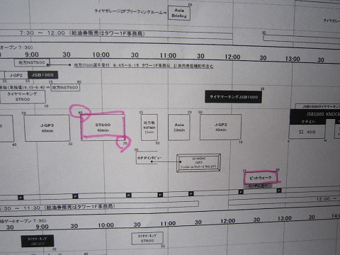 予選のタイムスケジュール 今日、27日(土)は予選です。 ST600の予選は10:40から。 なので、SUGOには2時間前の8:40までに入ればよかったので、珍しくのんびりのはず、でした。 昨日までは。 (^^;) |