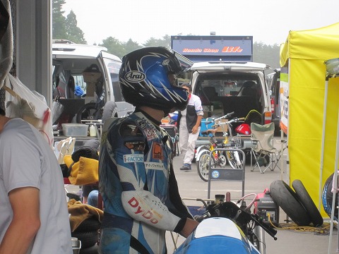 7:51 少し早めに いつもより少し早めに、つなぎに着替え、バイクとところにやってきた國川選手。 國川選手も走行前のチェックを進めます。 |