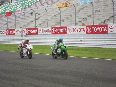 8:06 フリー走行中 8時から20分間のフリー走行が開始されました。 自分はピットロードでサインボードを出しているので、國川選手が通過しているときは、デジカメの撮影はムリ。 國川選手が通過した後、時間に余裕があるときに他のライダーの写真を。 ライムグリーンは#2? RS-ITOH。 #20番台にRS-ITOHは3台のバイクを走らせているので、写真がブレてわかりません。 そして、背後に迫るのは、HARC-PRO#634の小林龍太選手。 |