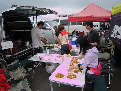 12:31 昼食 ST600の予選の後、昼食は自炊で。 昼前に予選が終わり、ST600クラスの今日のスケジュールは終了。 のんびりと昼食をとります。 今日の昼食は、焼きそばに炊き込みご飯と炭水化物コンビです。(笑) |