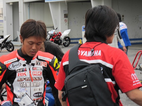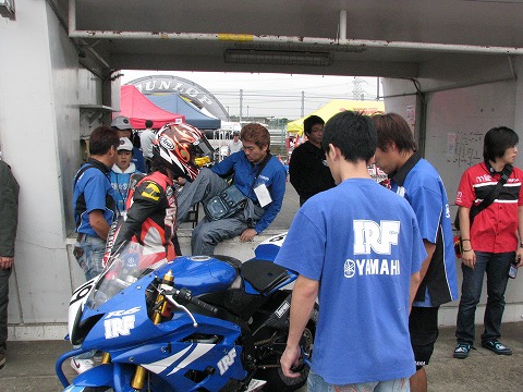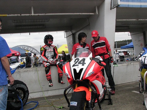14:29 ピットロードへ 前のJ-GP3のレースが終了し、バイクをピットロードに進めます。 今日のFujihide選手は、いつもより無駄な力が抜けている雰囲気です。 |