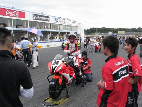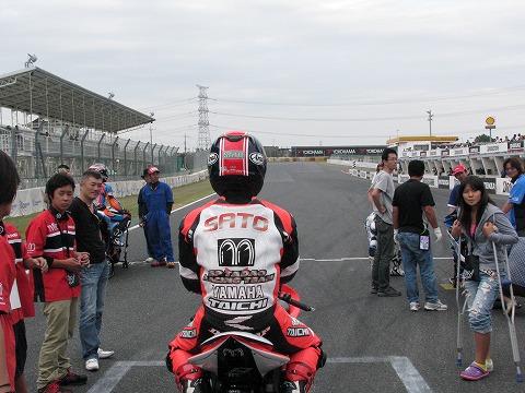 14:34 グリッドへ ピットロードにバイクを並べ、J-GP3の表彰式が終わった時点で、コースイン。 1周のサイティングラップを終え、Fujihide選手、4番グリッドにバイクを止めます。 右手前の2人は、忠男レーシングのライダー。 高校生ぐらい? 若いね! |