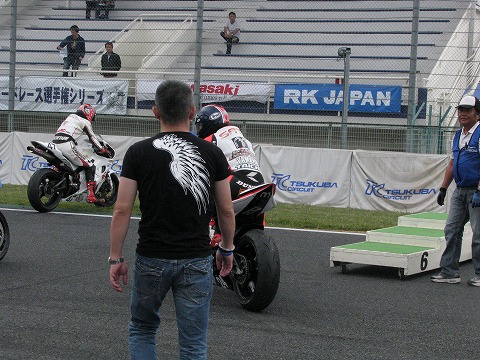 14:00 スタート進行 午前中の予選を4位で終えたFujihide選手、決勝に向け準備を進めます。 決勝のレースは14:20からの予定でしたが、前のレースが押してディレイ。 ただしスタート進行は既に始まり、パドックにバイクを並べ、コースインの時間を待ちます。 |
