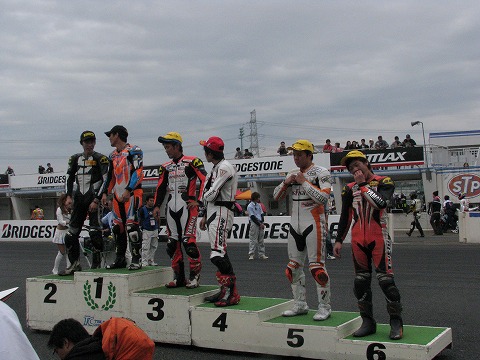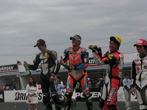 15:05 ヒーローインタビュー シャンパンファイトの後は、ヒーローインタビュー。 いつもは、元世界GP125チャンピオンの坂田選手がヒーローインタビューを行いますが、今日はモテギでMotoGPの予選が行われているため不在。 そのかわり、いつも実況放送をしているアナウンサーがインタビュー。 |