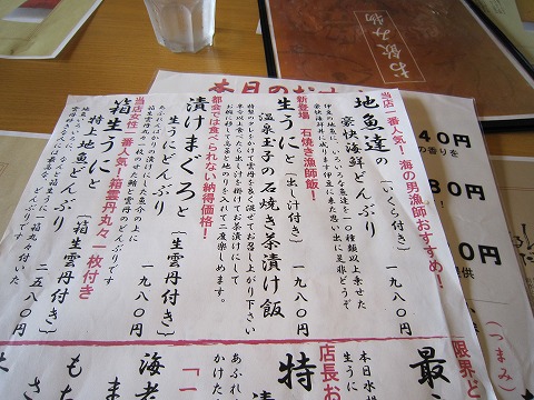 11:37 注文は 注文はあまり迷わず、おすすめの”地魚達の豪快海鮮どんぶり”。(¥1,980) ”伊豆の地魚に、いろいろな魚達を10種類以上乗せた海鮮丼”と言うことで、キャッチコピーだけ読んでも美味しそうだ。 (^o^) |