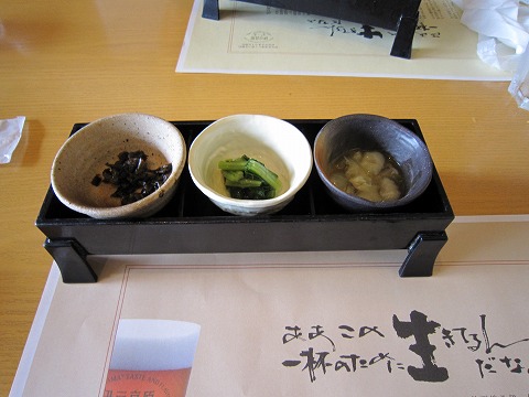 11:46 しばらくして しばらくして、先付け(?)が運ばれてきました。 『びっ、ビール飲みたーい!』(笑) どう見ても、お酒のあてである。 「ああこの一杯のためにいきてるんだなぁ。」 テーブルの上のランチシートに書かれている。 『おっしゃるとおりです。(爆)』 確かに、経営は伊豆高原ビールだ。 |