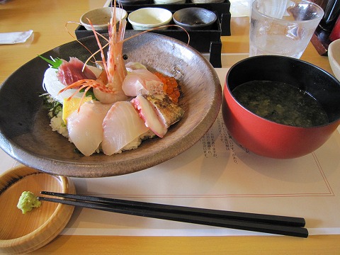 11:57 海鮮どんぶり みんなで雑談をしていると、しばらく待って、ご注文の海鮮どんぶりが運ばれてきました。 新鮮な本わさびが付いているところが、わさびの本場伊豆らしいですね。 さっそく、『いただきます!』 (^o^) 確かに、10種類以上の魚が入っているようです。 がっ!(汗) ご飯少なっっっ。 (>_<) ご飯の量は、普通の茶碗1杯分も無いんでは? ”豪快海鮮どんぶり”の”豪快”は器の”どんぶり”の形容詞だったのか? 確かに、どんぶりはでかい。 (-_-;) グルマンな自分としては、ちと物足りない。 (T_T) やっぱ、”豪快”とか書いたら、お腹いっぱいになるボリュームは欲しいよね。値段も値段だし。 |