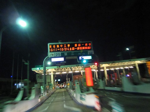 22:13 美作ICに到着 吹田JCTから中国自動車道に入り、約1時間半、美作ICに到着しました。 今夜の宿は美作にある湯郷温泉。 もう一息で到着です。 美作に着いたのを國川くんに連絡すると、まだサーキットで設営しているとのこと。 宿に先に入って、休むことにすることにします。 (^^)/~~~ |