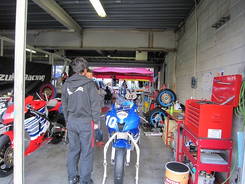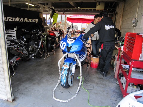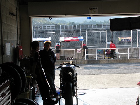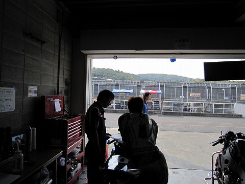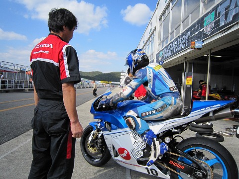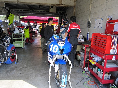 7:08 走行前に 走行前にメカの清水さんとセッティングについてミーティング。 ピットのお隣さんは、HONDAの社内チーム”SUZUKA RACING”。 ライダーは徳留選手。 |