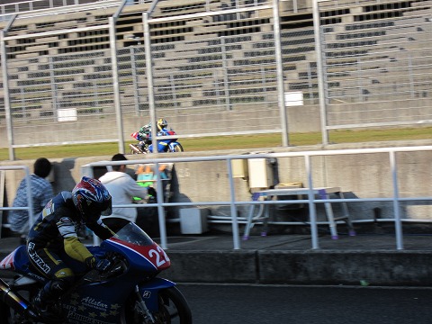 8:02 まずはGP-MONOから 8時になり、まずはGP-MONOクラスの練習走行が始まりました。 気温は20℃まで上がっていませんが、晴れた天気の中気持ち良さそう。 |