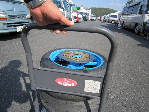 15:22 タイヤマーキング またもや台車にタイヤ載せて、移動。 今回はDUNLOPではなく、タイヤマーキングのために車検場に向かっています。 今回、岡山のレースでは、予選は2回。 そのため使える3セットです。 まずは、明日の1回目の予選のために、1本目をタイヤマーキング。 2種類あるコンパウンドの内、どっちを使ったかは、"秘密! (^^)” |