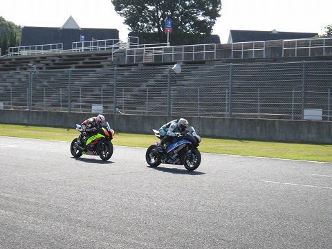 13:28 走行中 ST600クラスの走行中です。 写真は、#62のYAMAHA R6 BRIDGESTONEを履く横江選手と#11はYAMAHA R6にDUNLOPを履く佐藤裕児選手。 異なるタイヤを履く2台のYAMAHAのランデブー走行。 |