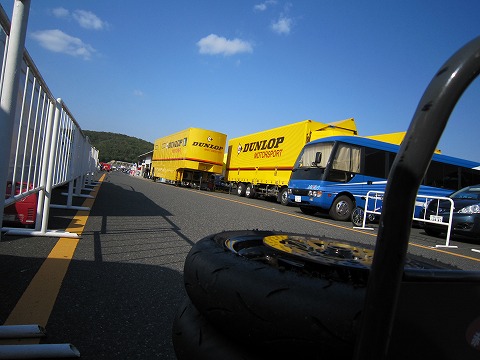 14:36 タイヤ交換2回目 2本目の走行も終わり、今日2回目のタイヤ交換。 目の前には、すっかりおなじみになったDUNLOPの巨大なトレーラー。 中はタイヤで一杯です。 今日は動いていると暑いけど、空はすっかり秋の気配だね。 |